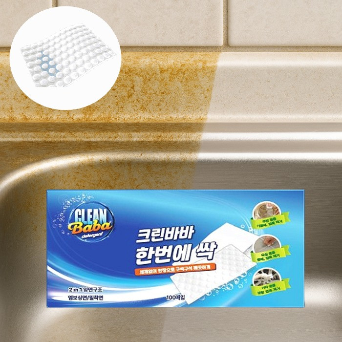반응 최상!!! 주문폭주!! 세제 없이 한 장으로 해결! 오직 물로만 하는 친환경 청소 시트! 무려 100매 9,900원 구성으로 넉넉하게 사용하세요! ✅세면대. 거울 물때 ✅가스레인지 ✅싱크대 정소 ✅자동차 어디든 사용 가능해요! 어린이 식기 소재로도 사용되는 멜라민100% 고압축, 고밀도, 초극세 3차원 망상구조! 엠보싱면과 밀착면 양면구조! 항균력 99.9% 8대 유해원소 불검출 테스트 완료!